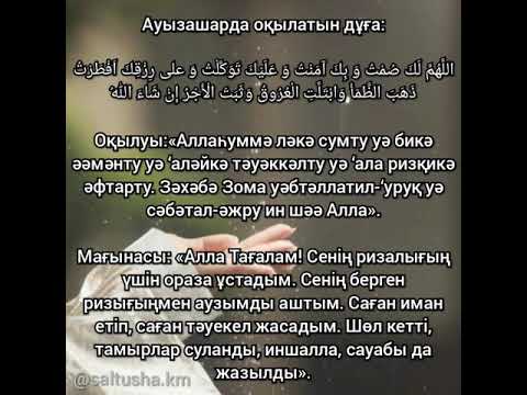 Ауыз Ашарда Ауызашар Дұғасы. Ауыз ашар дұғасы қазақша оқылуы:«аллаһуммә ләкә сумту уә бикә әәмәнту уә 'аләйкә тәуәккәлту уә 'ала ризқикә әфтарту уә саумәлғади мин шәһри рамадана нәуәйту, фәғфирлии мәә қаддамту уә мәә аххарту». «нәуәйту ән асумә саумә шәһри рамаданә минәл фәжри иләл мағриби халисан лилләһи таъалә.